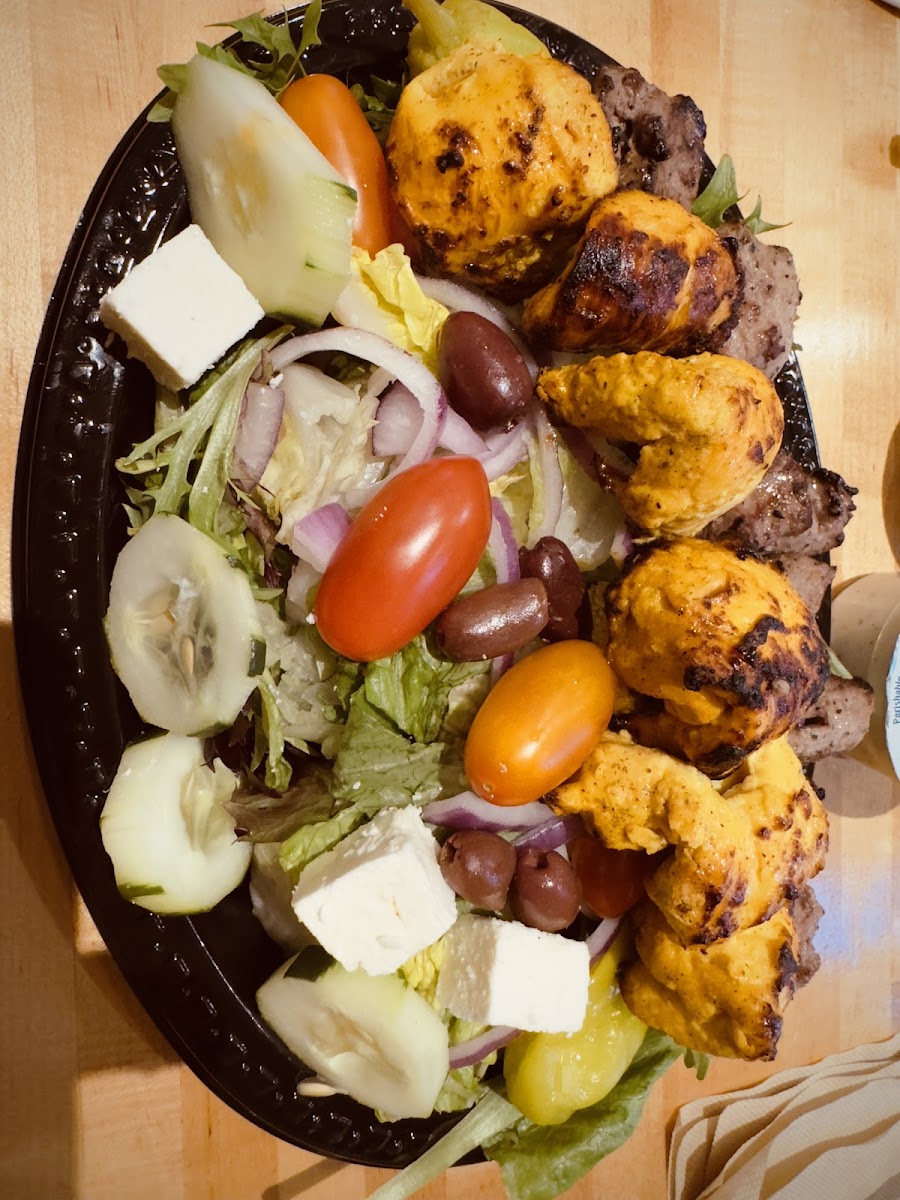 Moby Dick Super Combo a Combination of a Lamb and Chicken Kabob Served over a Mixed Green Salad
